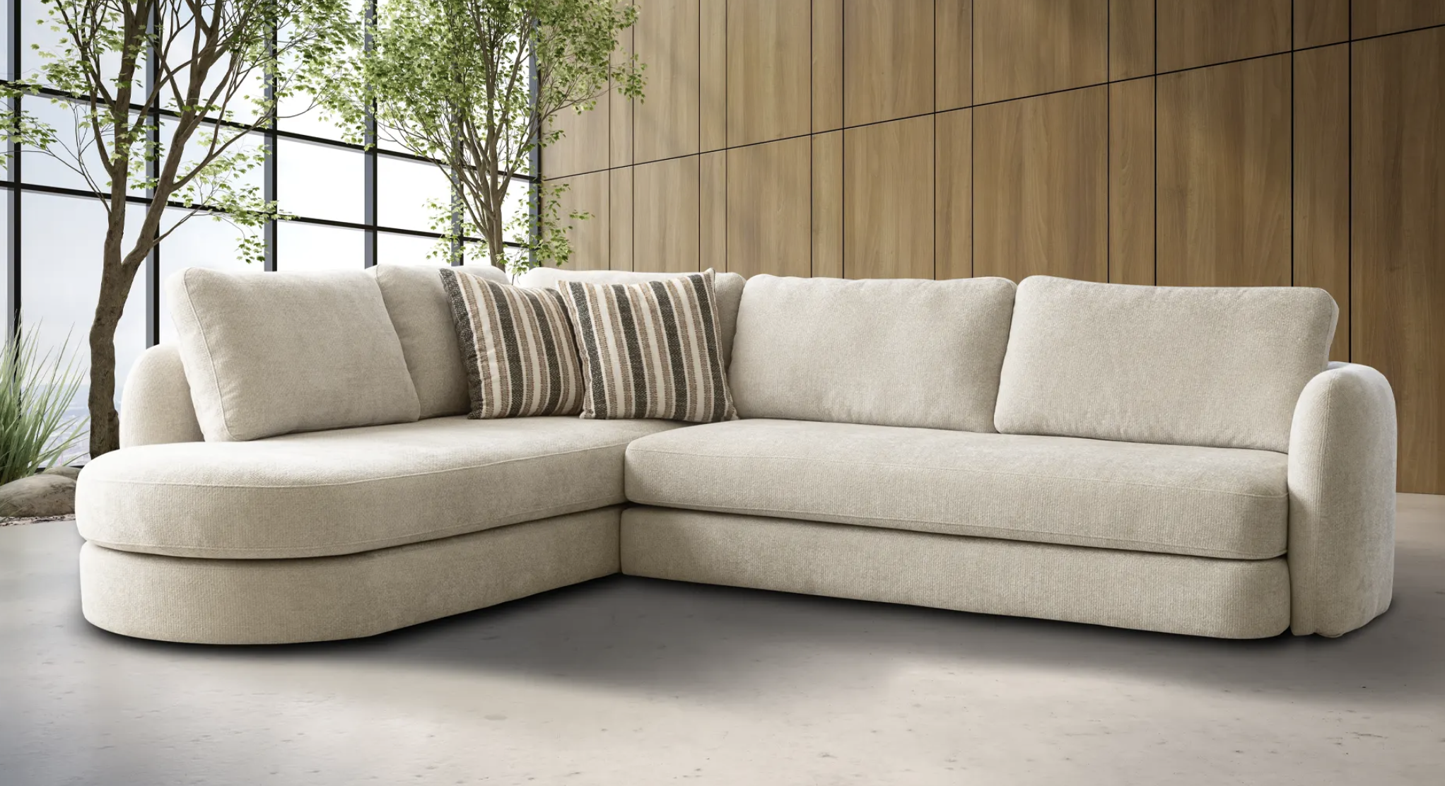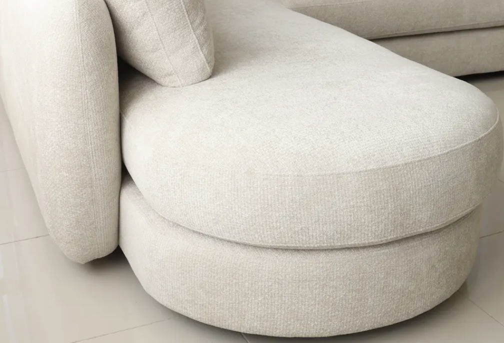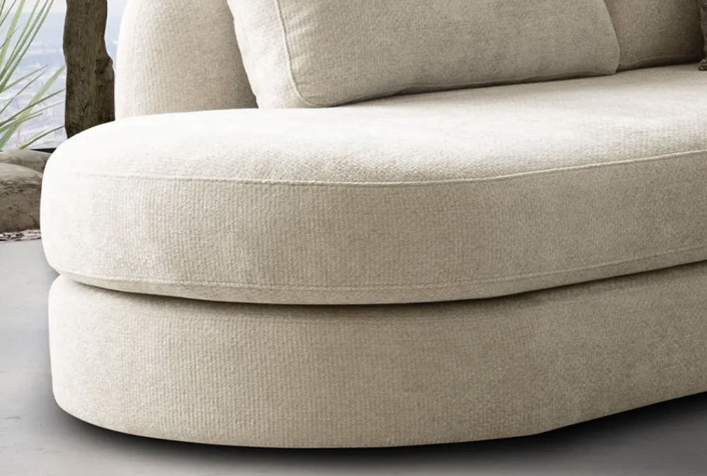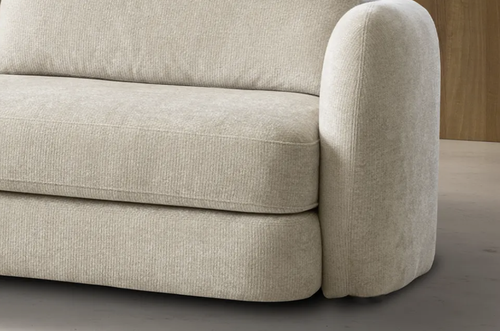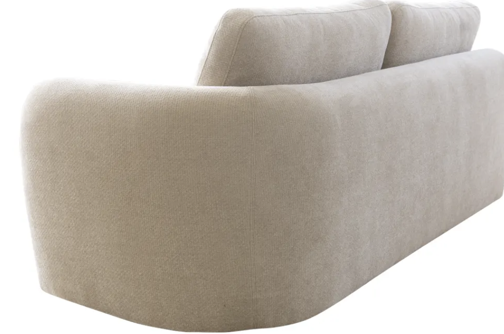 Η απαλή υφή του υφάσματος σε μπεζ απόχρωση χαρίζει διαχρονική κομψότητα, ενώ τα αφράτα μαξιλάρια πλάτης προσφέρουν εξαιρετική άνεση και σωστή στήριξη.