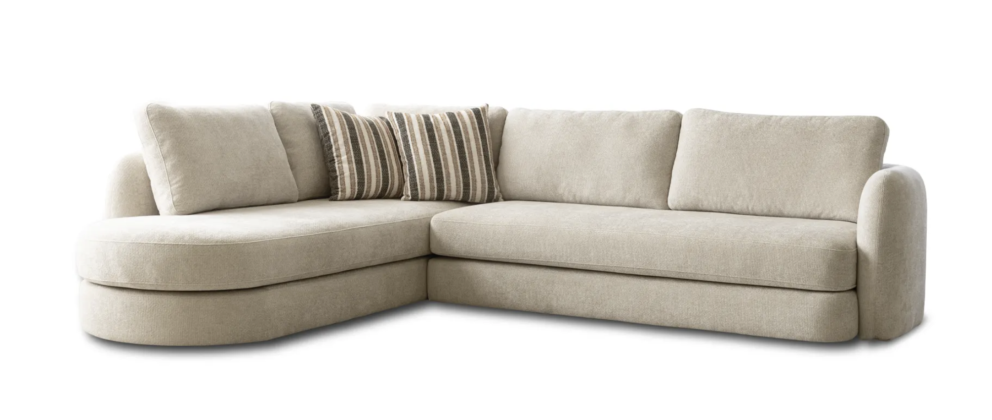 Η στρογγυλεμένη κατασκευή του αριστερού τελικού στοιχείου δίνει μία μοναδική, πιο φιλόξενη αίσθηση, ενώ τα διακοσμητικά μαξιλάρια με ριγέ
