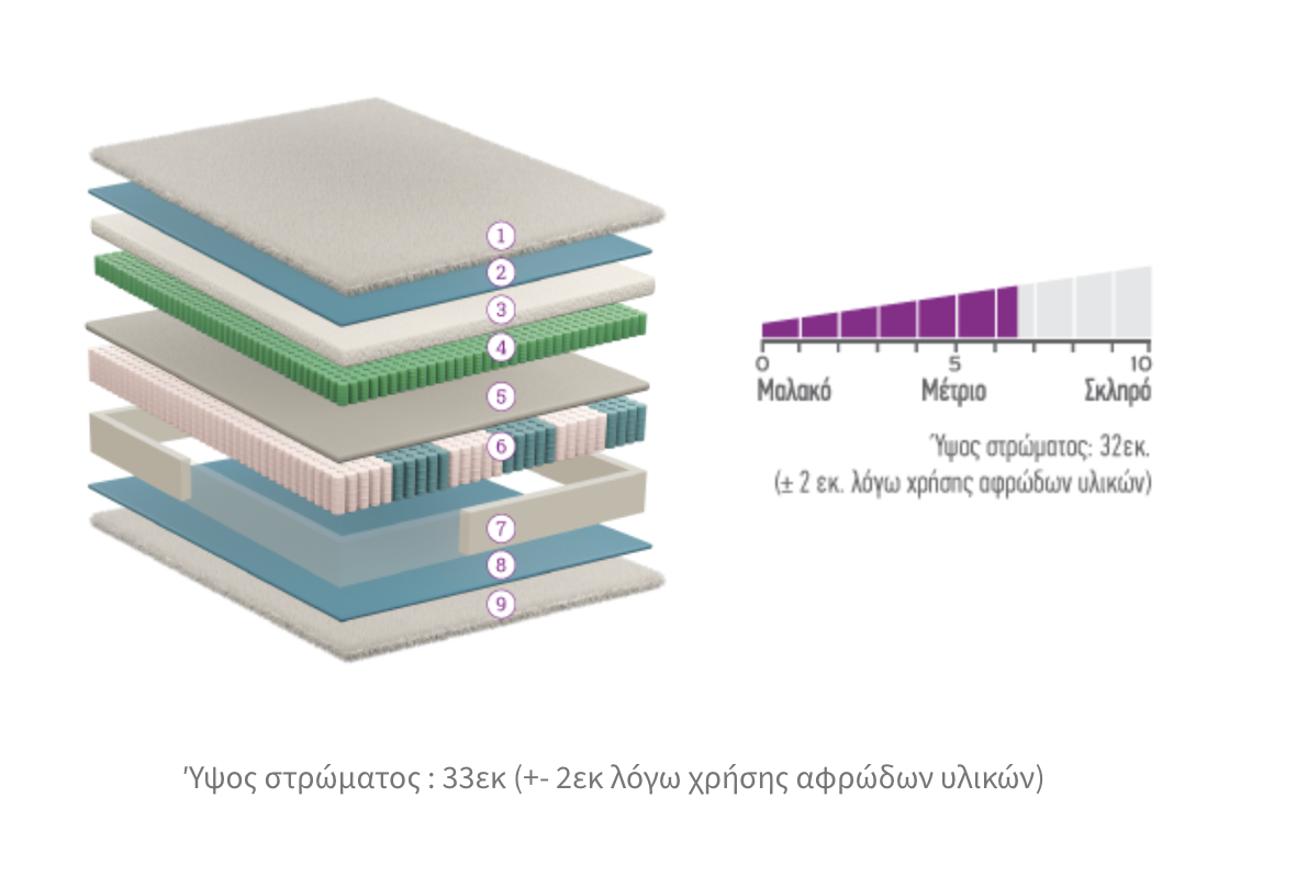 νέας γενιάς μικρά ανεξάρτητα ελατήρια με επίσης 7 ζώνες διαφορετικής σκληρότητας, 5 εκατοστά memory foam
